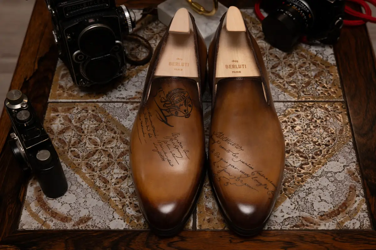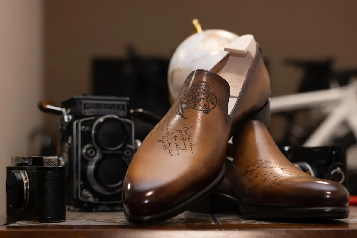 ただ、かなりの洒落者である後輩は、ベルルッティのカリグラフィにも興味があり、彼のセンスの良さに、カリグラフィは写真で見ているほど派手ではなく、実際に履くと自然に馴染むというデザインの本質を見抜いています。