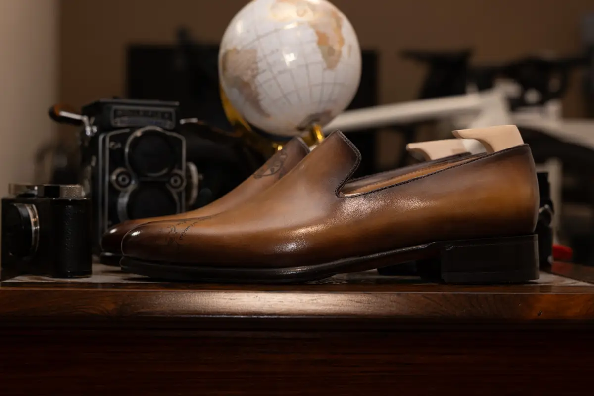 20年くらい前に、ベルルティを愛用していましたが、スーツを日常的に着なくなりドレスシューズを履く機会が減り、今の私のカジュアルな格好には少し華やかであるベルルッティの靴を身につける機会が減ってしまい後輩に譲りました。その後輩はベルルッティの靴を相当気に入り、私より履く機会も多くこまめに手入れを欠かさず愛用しています。同行した友人はアンディを愛用しており、少しグリーンを交えた薄いタバコカラーのパティーヌで仕上げており、少しおしゃれをする際には必ず履いています。