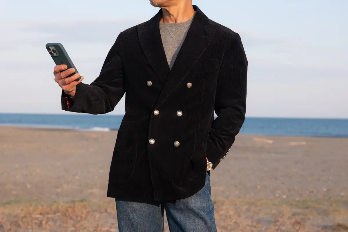 今回、写真を撮り直してみて感じるのは、ブルネロクチネリが使用しているコーデュロイの上質さと柔らかさ、ジャケットの仕立ての良さが感じられます。