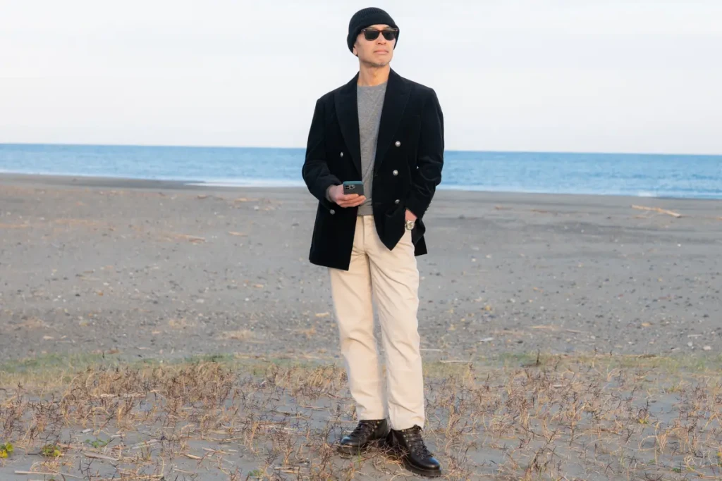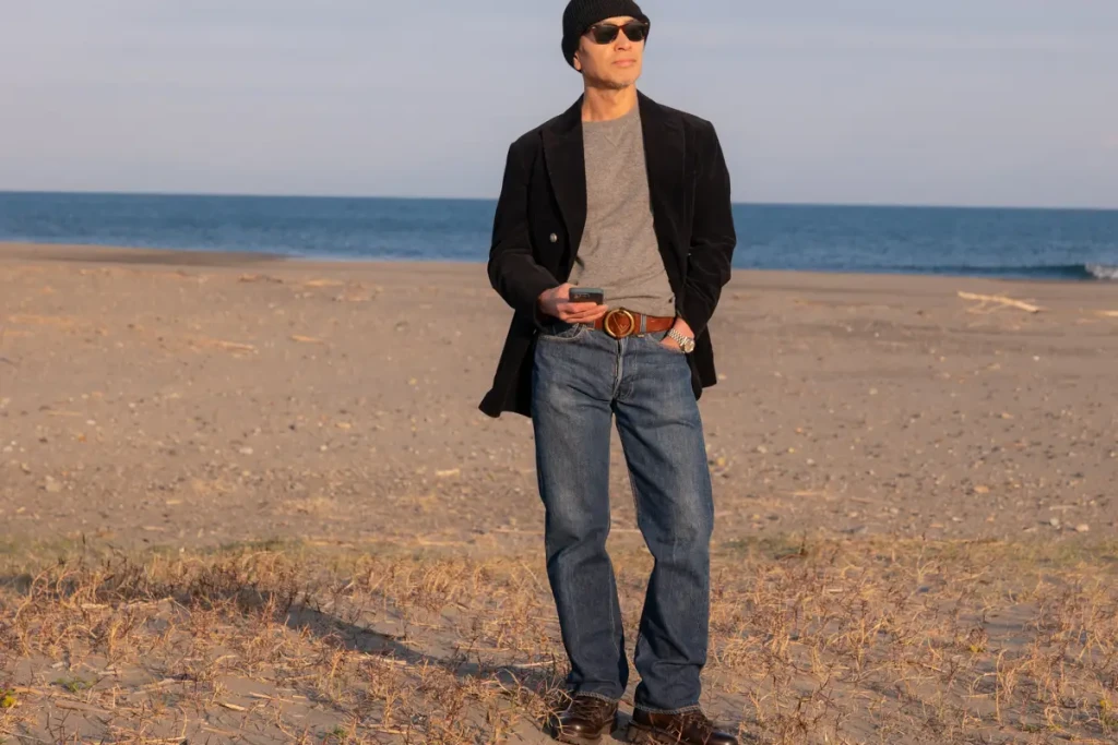 今回、ブルネロクチネリのコーデュロイジャケットを古着の501とブルネロクチネリのボトムで合わせてみました。撮った写真を比べると、やはりトップボトムをブルネロクチネリで合わせた方がスッキリと上品にまとまります。