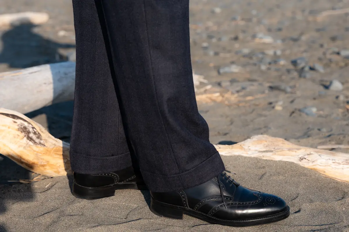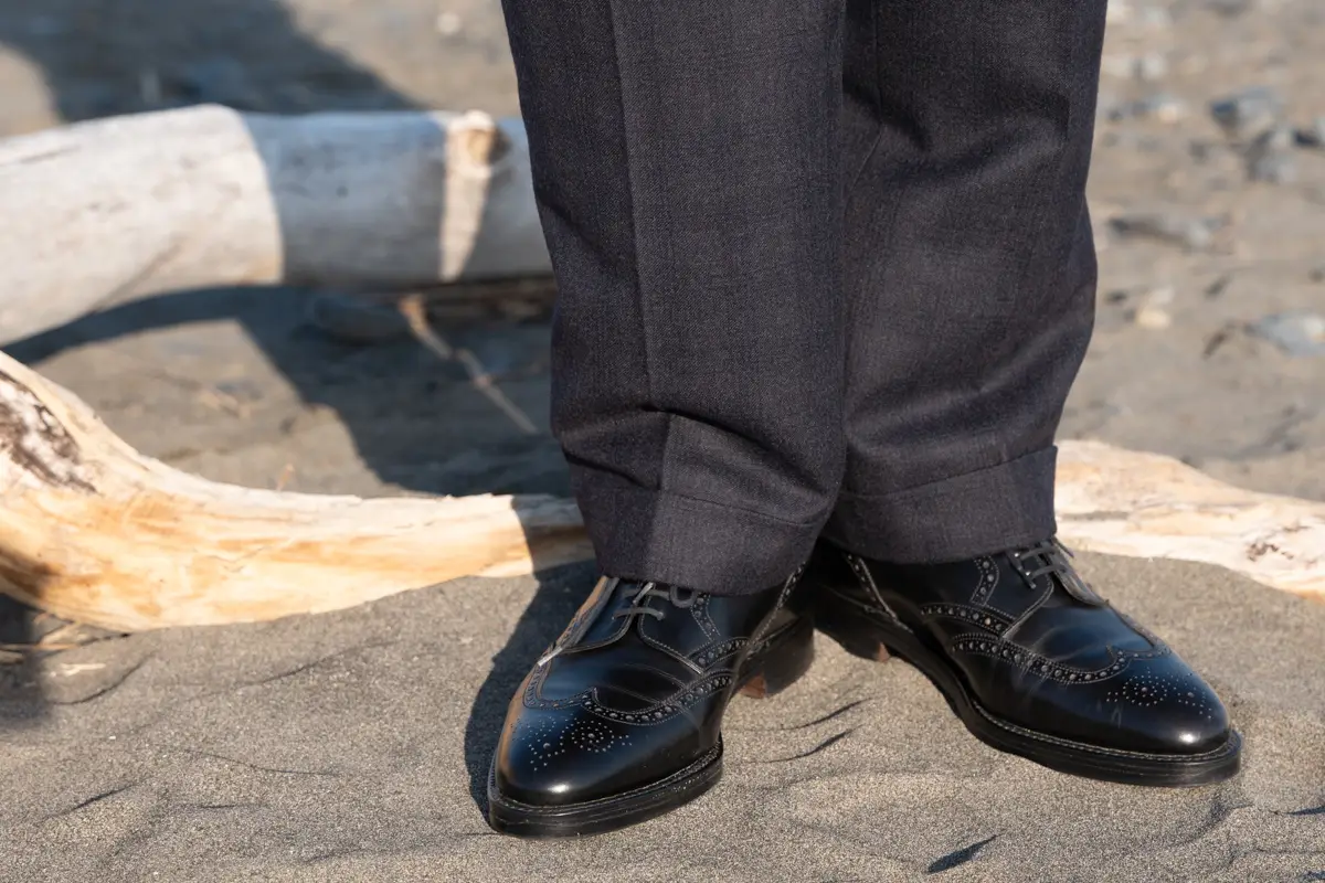 通常スーツに合わせるなら、オックスフォードと言われる内羽で、プレーントゥか、セミブローグ、シングルソールの靴をイメージします。フルブローグの外羽、ダブルソールは、元々ハンティングなどで使われている靴がルーツになっておりカジュアルなイメージがあります。そのことからスーツに合わせる場合も、フォーマルなシーンでは敬遠される傾向があります。
