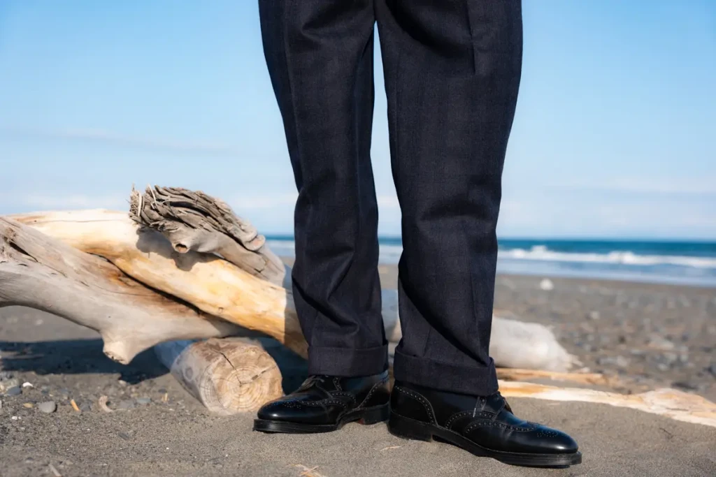 私個人的な意見ですが、イタリアのクラシックには、茶色のイタリアンシューズを合わせるのが王道ですが、無骨な英国靴の黒革靴を履いて、イタリア的な華美な要素を少し抑えるような装いを楽しみたい方にはお勧めです。