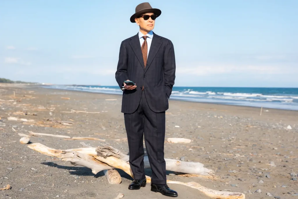 今回の記事で着用例として撮影した写真は、20年前にタイユアタイで購入したKitonのグレンチェック柄のダークネイビーのスーツにボトムとしてダービーを履いています。スーツのサイズ感が現代と比べると少しルーズに見えますが、別の視点で見ると相当クラシックなスーツスタイルに見えます。