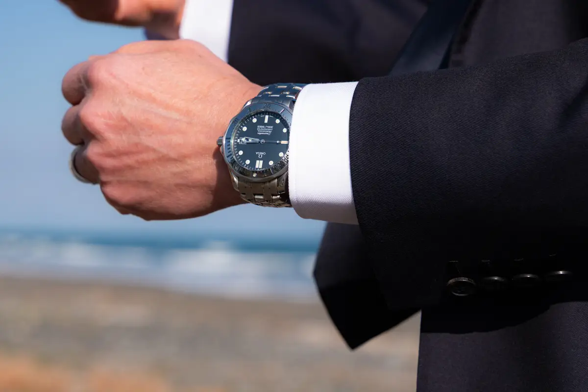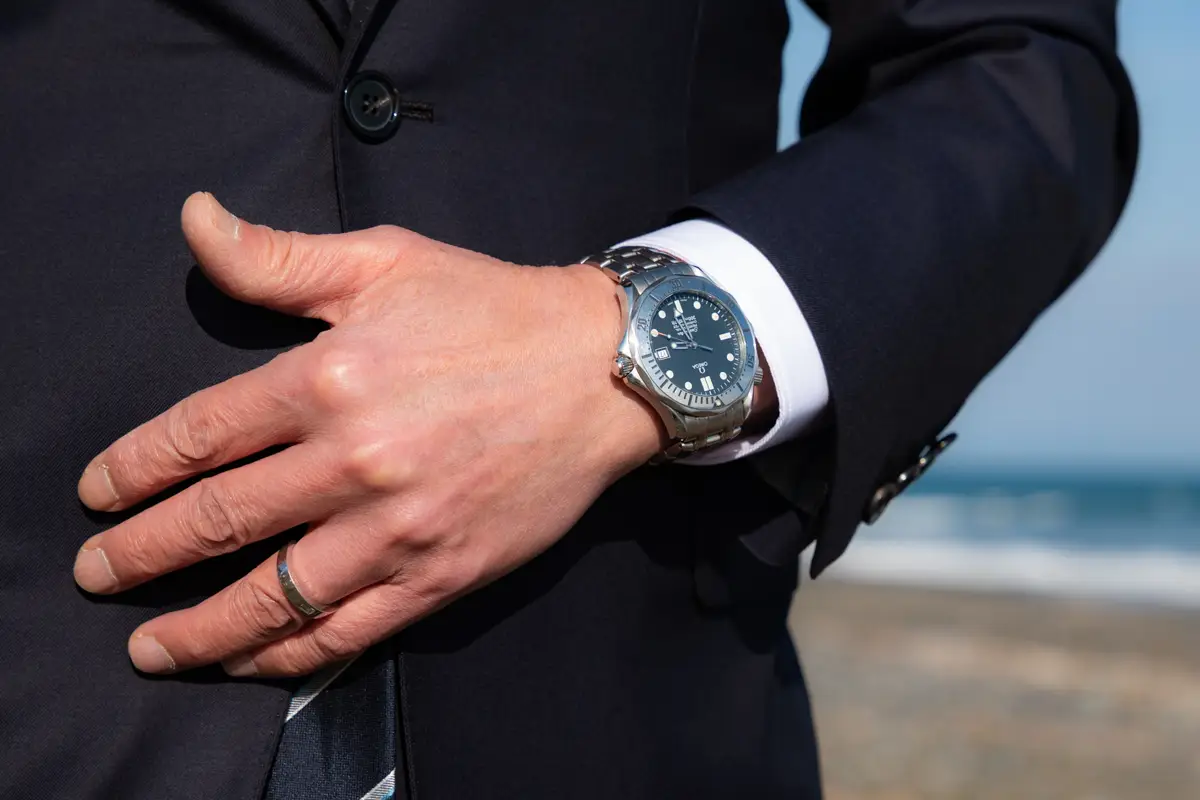 今回、久々に取り出し、スーツと合わせた写真をとっています。ステンレスのスポーツウォッチであり、300mのダイビングまで対応出来る本格的なダイバーウォッチですが、スーツに合わせても違和感がありません。スポーツウォッチなので、デニムなどのカジュアルなスタイルでの相性は当然ながら、スーツスタイルでも全く問題がないので、着用機会を限定しない汎用性の高さがあります。